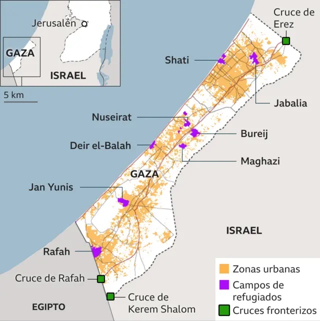 La Franja de Gaza es un estrecho territorio costero de 365 km², situado entre Israel y Egipto, con acceso al mar Mediterráneo. Alberga a unos 2,3 millones de personas, en su mayoría descendientes de refugiados palestinos de la guerra árabe-israelí de 1948. Desde 2007, tras la toma del poder por Hamás, está sometida a un bloqueo israelí-egipcio que restringe el flujo de bienes y personas.